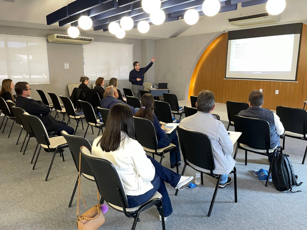 Na segunda parte da reunião, o diretor Renato Macedo apresentou o Programa de Excelência do Sistema Fetrancesc e o Programa de Avaliação, ferramentas essenciais para o fortalecimento e aprimoramento da atuação dos sindicatos.